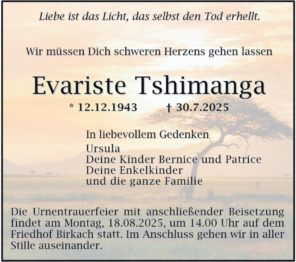 Hier finden Sie alle Traueranzeigen aus der Zeitung, die bisher für Evariste Tshimanga erschienen sind. Weitere Traueranzeigen, die in der Zeitung erscheinen, werden hier ebenfalls aufgelistet