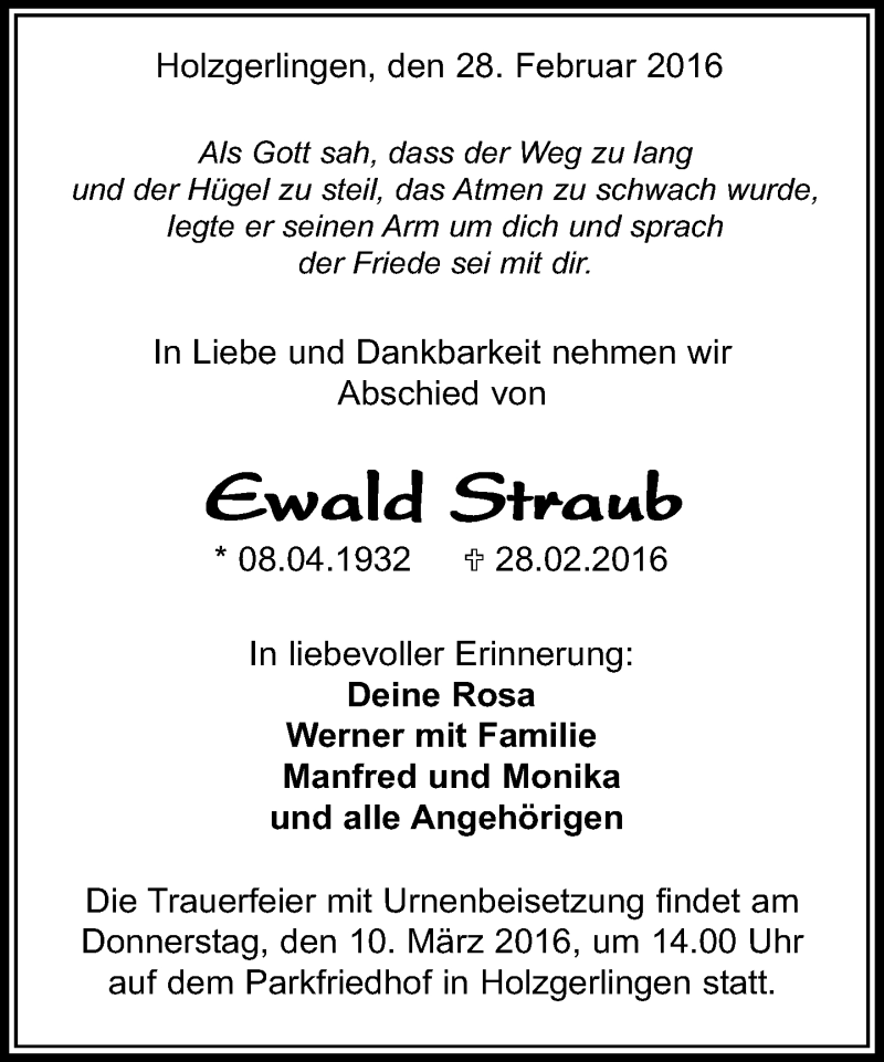 Hier finden Sie alle Traueranzeigen aus der Zeitung, die bisher für Ewald Straub erschienen sind. Weitere Traueranzeigen, die in der Zeitung erscheinen, werden hier ebenfalls aufgelistet