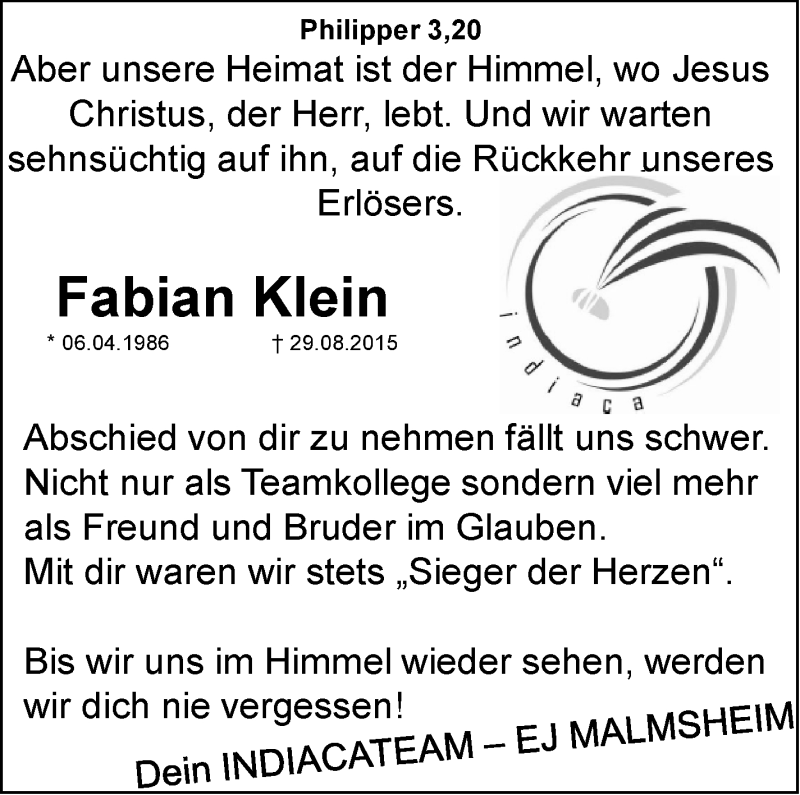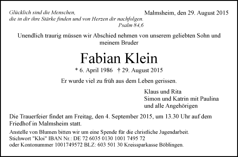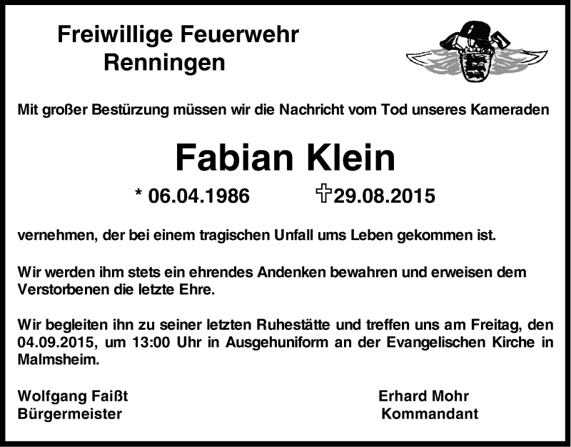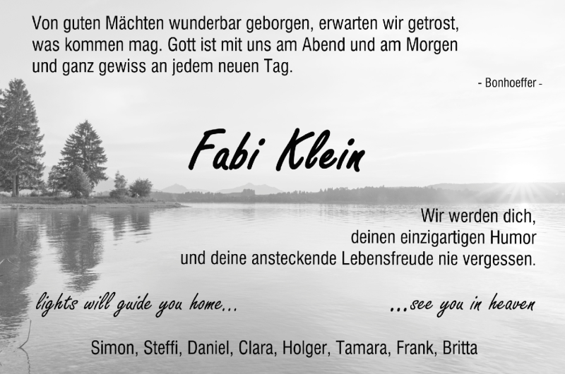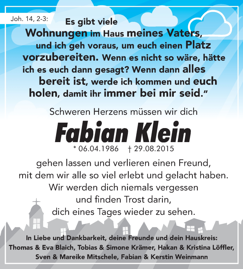 Hier finden Sie alle Traueranzeigen aus der Zeitung, die bisher für Fabian Klein erschienen sind. Weitere Traueranzeigen, die in der Zeitung erscheinen, werden hier ebenfalls aufgelistet