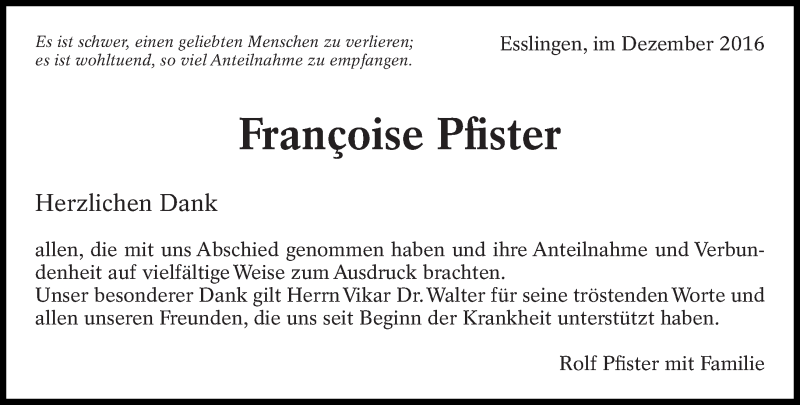 Hier finden Sie alle Traueranzeigen aus der Zeitung, die bisher für Françoise Pfister erschienen sind. Weitere Traueranzeigen, die in der Zeitung erscheinen, werden hier ebenfalls aufgelistet