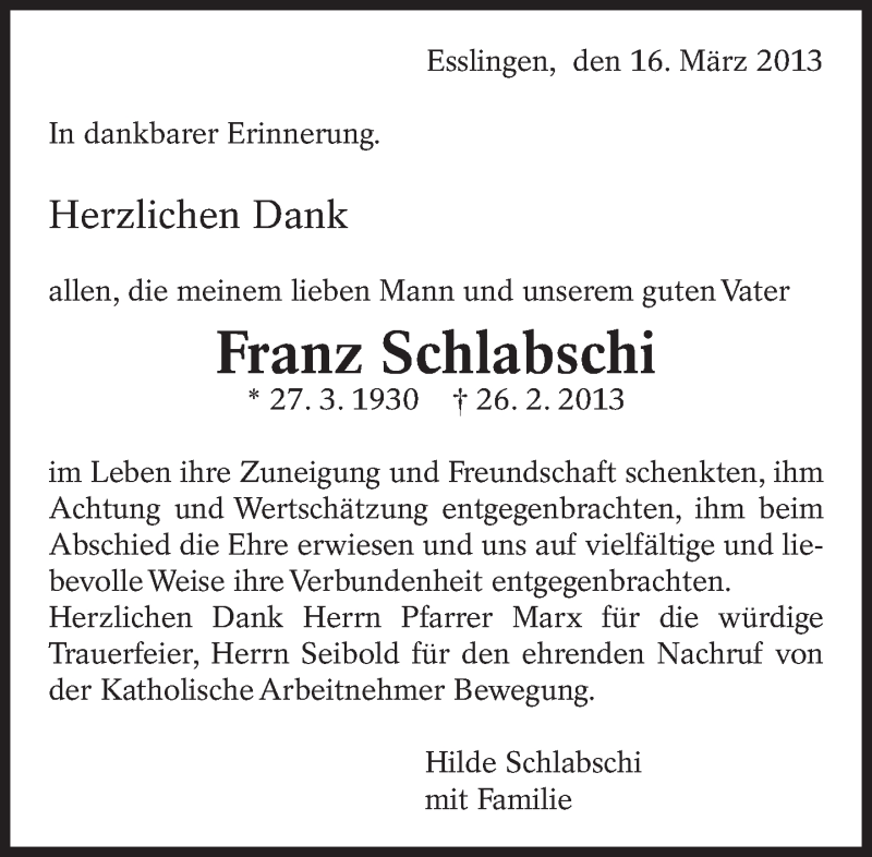 Hier finden Sie alle Traueranzeigen aus der Zeitung, die bisher für Franz Schlabschi erschienen sind. Weitere Traueranzeigen, die in der Zeitung erscheinen, werden hier ebenfalls aufgelistet