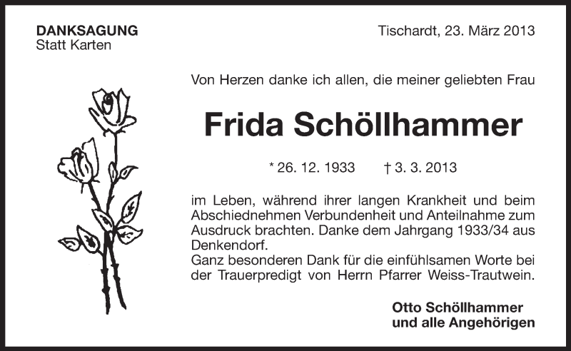 Hier finden Sie alle Traueranzeigen aus der Zeitung, die bisher für Frida Schöllhammer erschienen sind. Weitere Traueranzeigen, die in der Zeitung erscheinen, werden hier ebenfalls aufgelistet