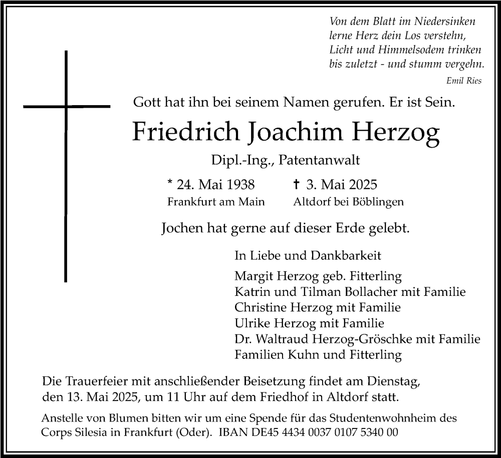 Hier finden Sie alle Traueranzeigen aus der Zeitung, die bisher für Friedrich Joachim Herzog erschienen sind. Weitere Traueranzeigen, die in der Zeitung erscheinen, werden hier ebenfalls aufgelistet