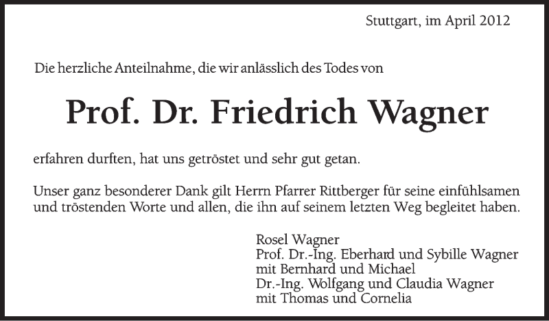Hier finden Sie alle Traueranzeigen aus der Zeitung, die bisher für Friedrich Wagner erschienen sind. Weitere Traueranzeigen, die in der Zeitung erscheinen, werden hier ebenfalls aufgelistet
