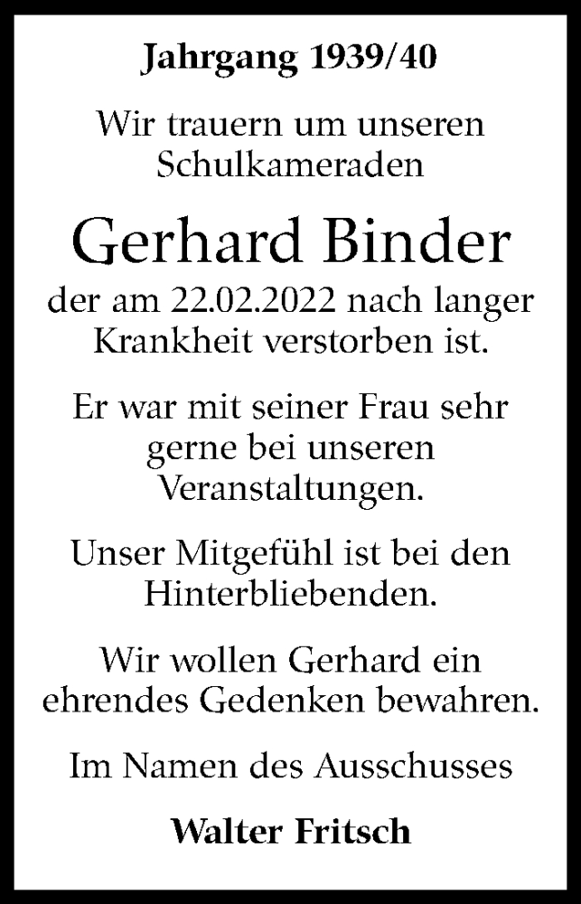 Hier finden Sie alle Traueranzeigen aus der Zeitung, die bisher für Gerhard Binder erschienen sind. Weitere Traueranzeigen, die in der Zeitung erscheinen, werden hier ebenfalls aufgelistet