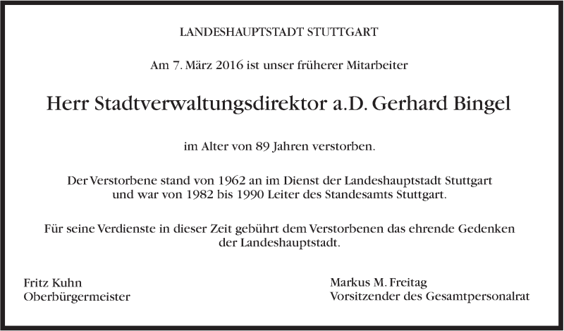 Hier finden Sie alle Traueranzeigen aus der Zeitung, die bisher für Gerhard Bingel erschienen sind. Weitere Traueranzeigen, die in der Zeitung erscheinen, werden hier ebenfalls aufgelistet