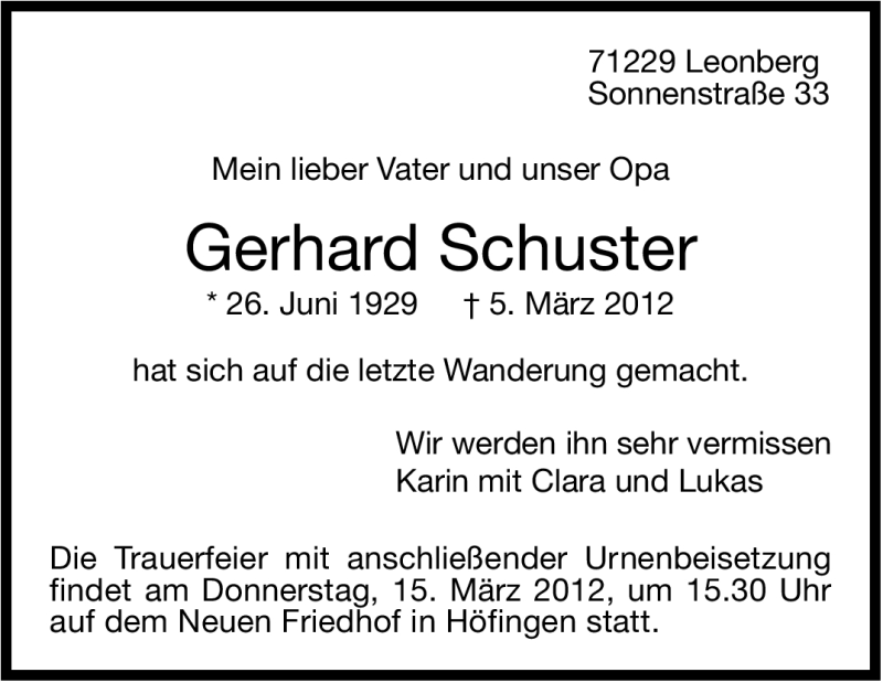 Hier finden Sie alle Traueranzeigen aus der Zeitung, die bisher für Gerhard Schuster erschienen sind. Weitere Traueranzeigen, die in der Zeitung erscheinen, werden hier ebenfalls aufgelistet