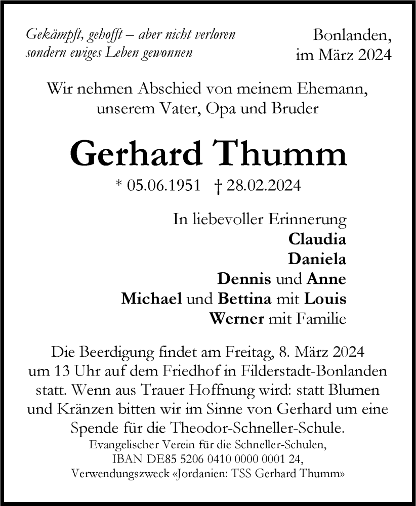 Hier finden Sie alle Traueranzeigen aus der Zeitung, die bisher für Gerhard Thumm erschienen sind. Weitere Traueranzeigen, die in der Zeitung erscheinen, werden hier ebenfalls aufgelistet