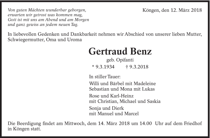 Hier finden Sie alle Traueranzeigen aus der Zeitung, die bisher für Gertraud Benz erschienen sind. Weitere Traueranzeigen, die in der Zeitung erscheinen, werden hier ebenfalls aufgelistet