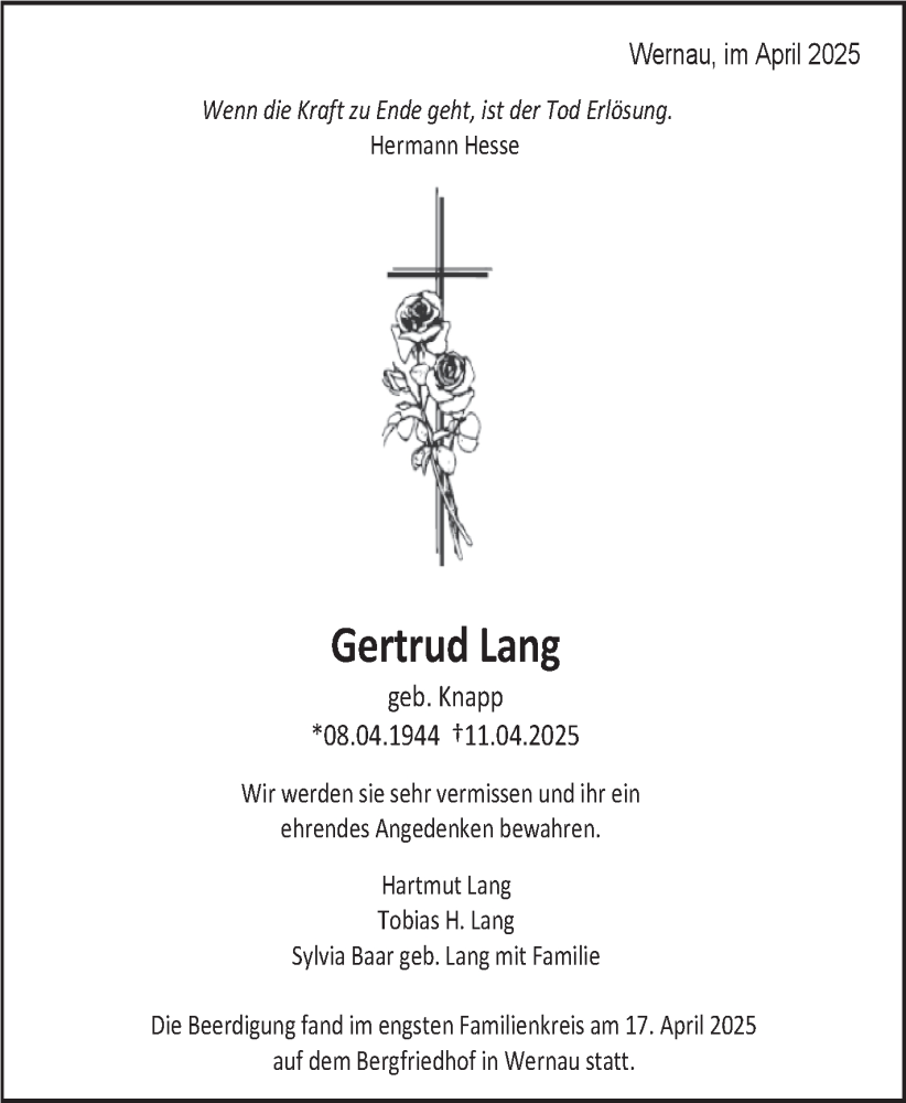 Hier finden Sie alle Traueranzeigen aus der Zeitung, die bisher für Gertrud Lang erschienen sind. Weitere Traueranzeigen, die in der Zeitung erscheinen, werden hier ebenfalls aufgelistet