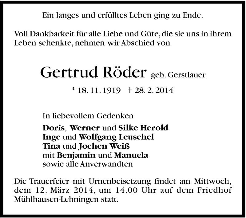 Hier finden Sie alle Traueranzeigen aus der Zeitung, die bisher für Gertrud Röder erschienen sind. Weitere Traueranzeigen, die in der Zeitung erscheinen, werden hier ebenfalls aufgelistet