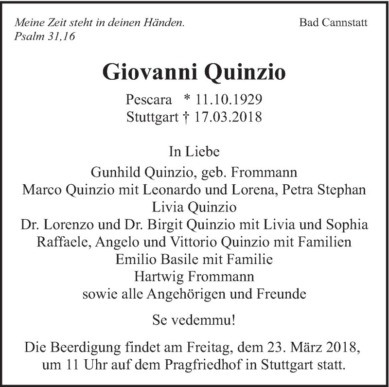 Hier finden Sie alle Traueranzeigen aus der Zeitung, die bisher für Giovanni Quinzio erschienen sind. Weitere Traueranzeigen, die in der Zeitung erscheinen, werden hier ebenfalls aufgelistet