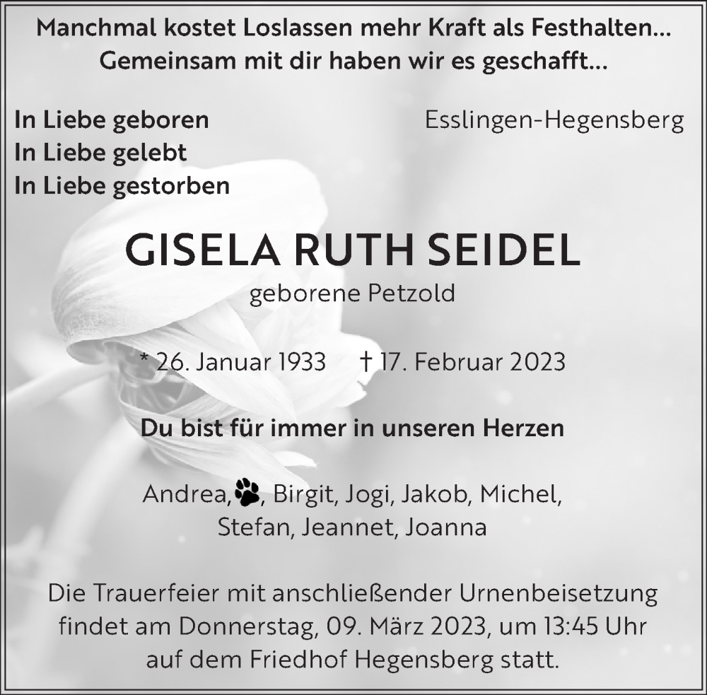 Hier finden Sie alle Traueranzeigen aus der Zeitung, die bisher für Gisela Ruth Seidel erschienen sind. Weitere Traueranzeigen, die in der Zeitung erscheinen, werden hier ebenfalls aufgelistet