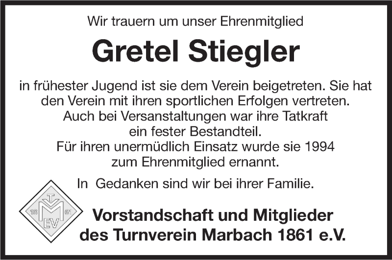 Hier finden Sie alle Traueranzeigen aus der Zeitung, die bisher für Gretel Stiegler erschienen sind. Weitere Traueranzeigen, die in der Zeitung erscheinen, werden hier ebenfalls aufgelistet