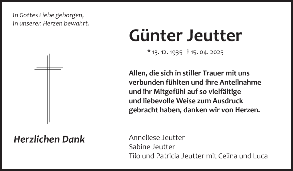 Hier finden Sie alle Traueranzeigen aus der Zeitung, die bisher für Günter Jeutter erschienen sind. Weitere Traueranzeigen, die in der Zeitung erscheinen, werden hier ebenfalls aufgelistet