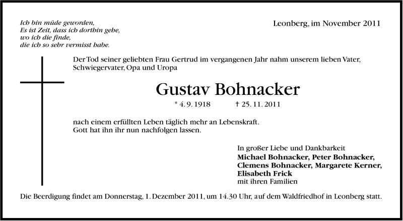 Hier finden Sie alle Traueranzeigen aus der Zeitung, die bisher für Gustav Bohnacker erschienen sind. Weitere Traueranzeigen, die in der Zeitung erscheinen, werden hier ebenfalls aufgelistet