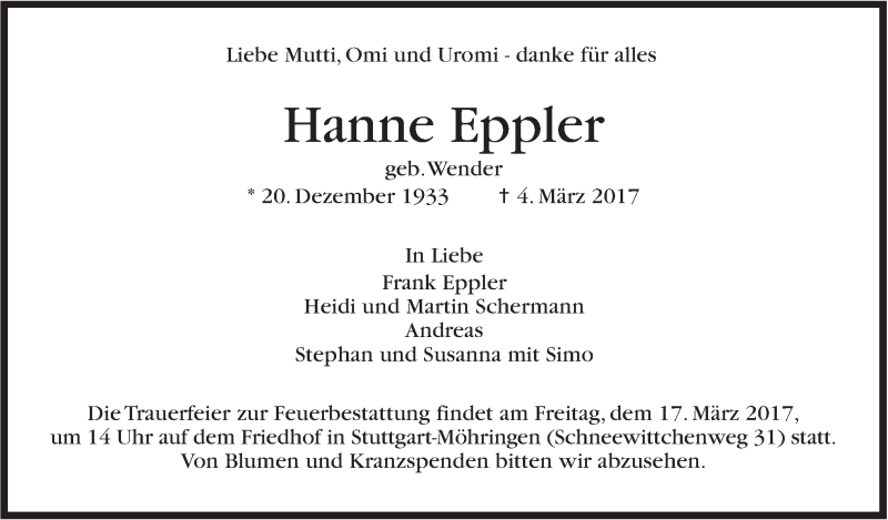 Hier finden Sie alle Traueranzeigen aus der Zeitung, die bisher für Hanne Eppler erschienen sind. Weitere Traueranzeigen, die in der Zeitung erscheinen, werden hier ebenfalls aufgelistet