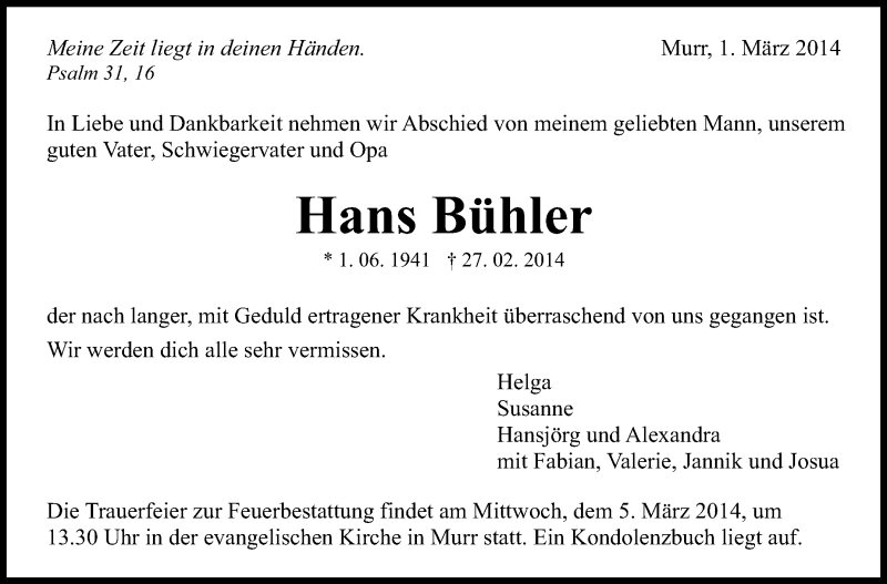 Hier finden Sie alle Traueranzeigen aus der Zeitung, die bisher für Hans Bühler erschienen sind. Weitere Traueranzeigen, die in der Zeitung erscheinen, werden hier ebenfalls aufgelistet