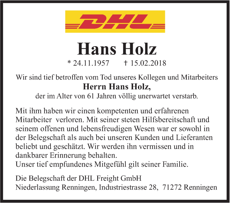 Hier finden Sie alle Traueranzeigen aus der Zeitung, die bisher für Hans Holz erschienen sind. Weitere Traueranzeigen, die in der Zeitung erscheinen, werden hier ebenfalls aufgelistet