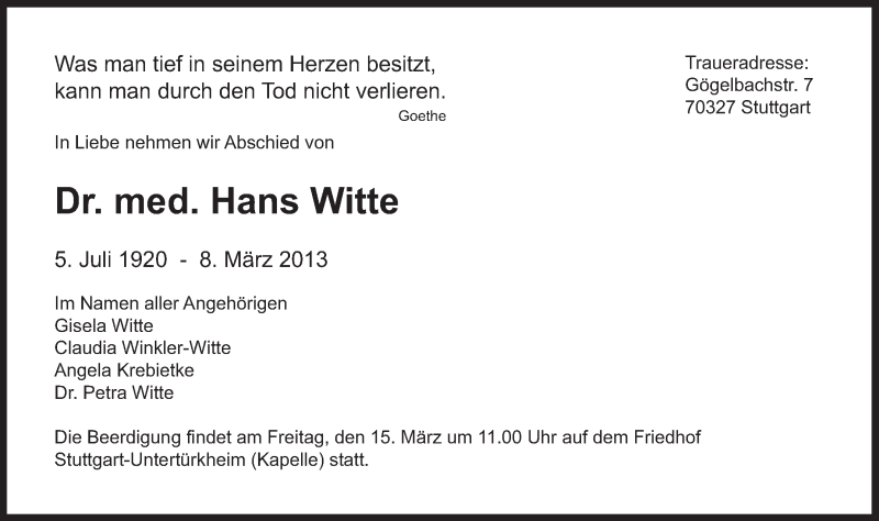 Hier finden Sie alle Traueranzeigen aus der Zeitung, die bisher für Hans Witte erschienen sind. Weitere Traueranzeigen, die in der Zeitung erscheinen, werden hier ebenfalls aufgelistet