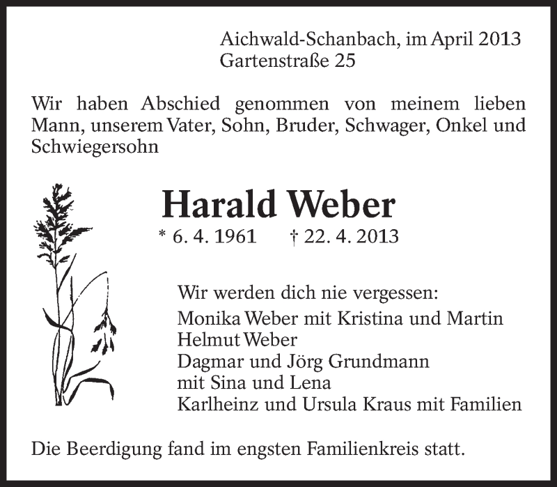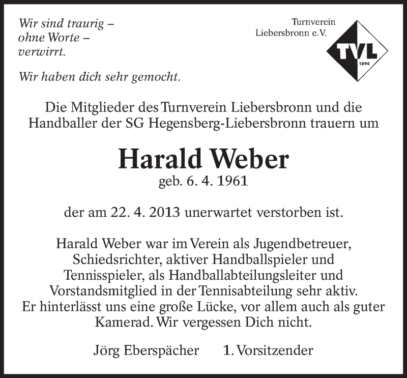 Hier finden Sie alle Traueranzeigen aus der Zeitung, die bisher für Harald Weber erschienen sind. Weitere Traueranzeigen, die in der Zeitung erscheinen, werden hier ebenfalls aufgelistet