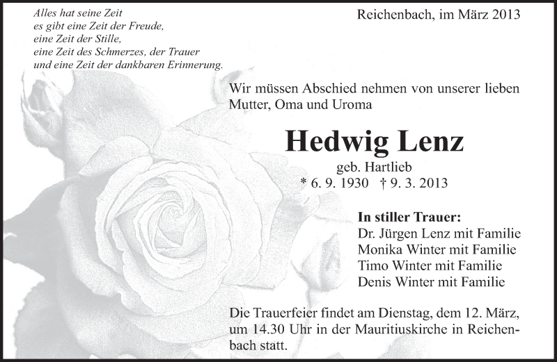 Hier finden Sie alle Traueranzeigen aus der Zeitung, die bisher für Hedwig Lenz erschienen sind. Weitere Traueranzeigen, die in der Zeitung erscheinen, werden hier ebenfalls aufgelistet