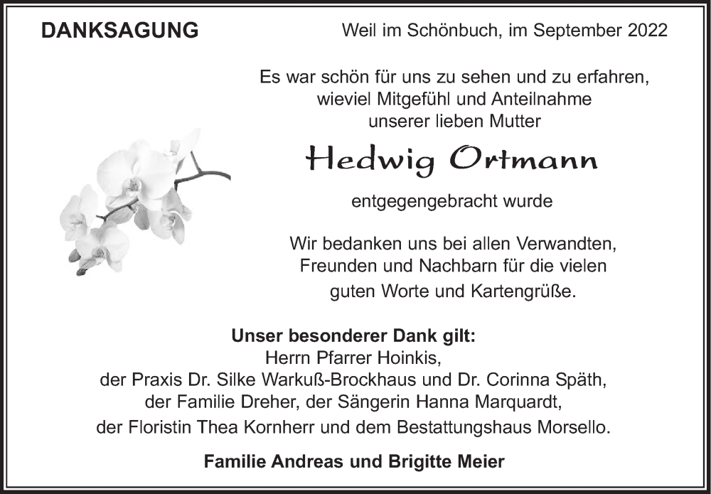 Hier finden Sie alle Traueranzeigen aus der Zeitung, die bisher für Hedwig Ortmann erschienen sind. Weitere Traueranzeigen, die in der Zeitung erscheinen, werden hier ebenfalls aufgelistet