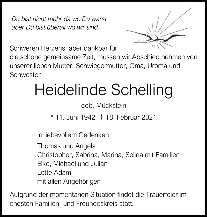 Hier finden Sie alle Traueranzeigen aus der Zeitung, die bisher für Heidelinde Schelling erschienen sind. Weitere Traueranzeigen, die in der Zeitung erscheinen, werden hier ebenfalls aufgelistet