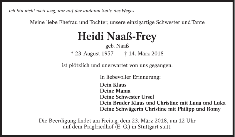 Hier finden Sie alle Traueranzeigen aus der Zeitung, die bisher für Heidi Naaß-Frey erschienen sind. Weitere Traueranzeigen, die in der Zeitung erscheinen, werden hier ebenfalls aufgelistet