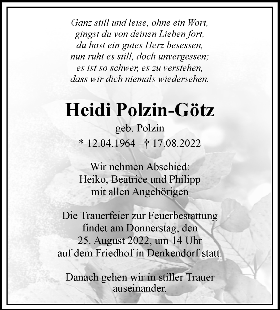 Hier finden Sie alle Traueranzeigen aus der Zeitung, die bisher für Heidi Polzin-Götz erschienen sind. Weitere Traueranzeigen, die in der Zeitung erscheinen, werden hier ebenfalls aufgelistet