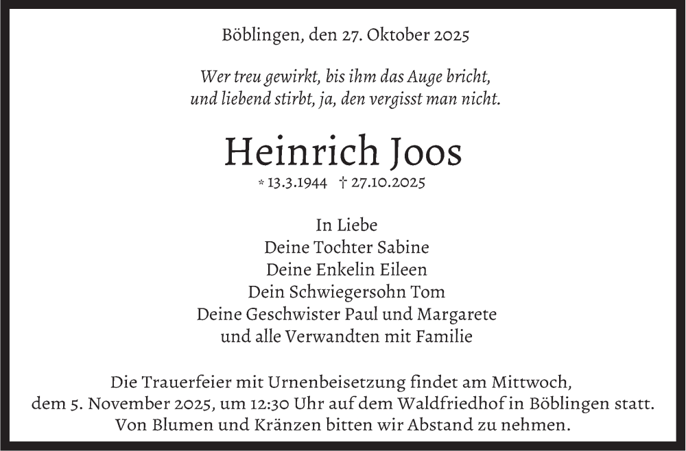 Hier finden Sie alle Traueranzeigen aus der Zeitung, die bisher für Heinrich Joos erschienen sind. Weitere Traueranzeigen, die in der Zeitung erscheinen, werden hier ebenfalls aufgelistet
