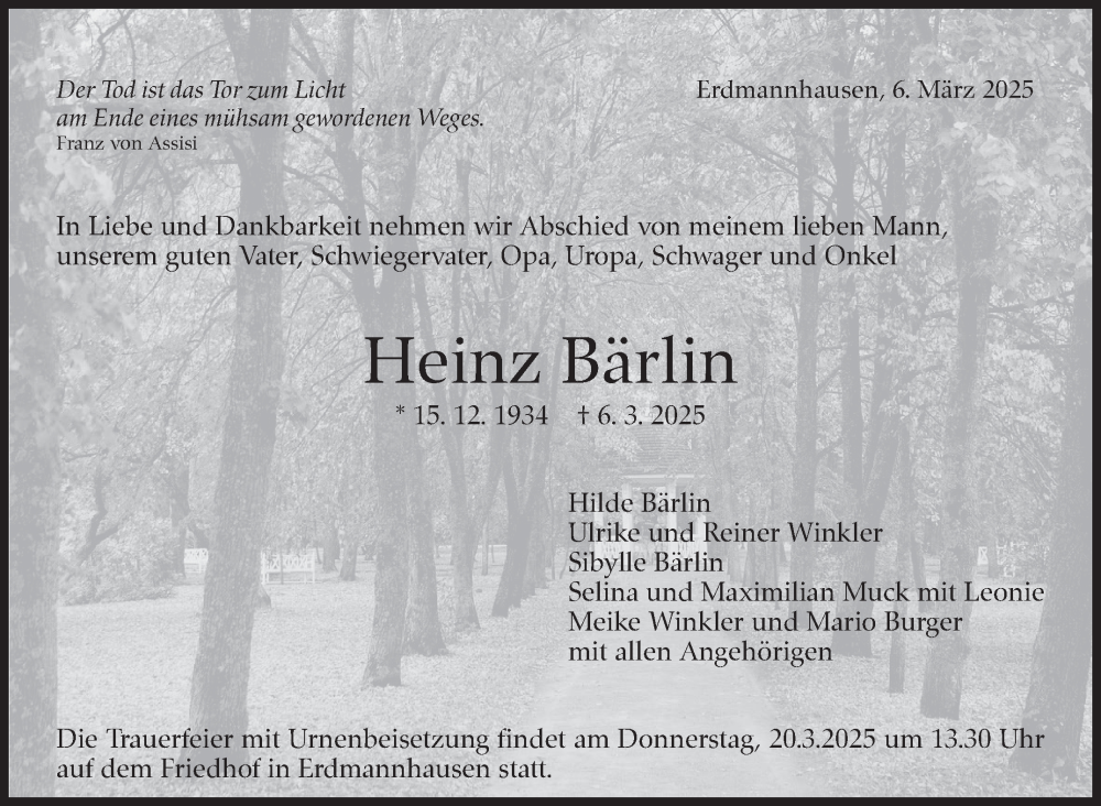 Hier finden Sie alle Traueranzeigen aus der Zeitung, die bisher für Heinz Bärlin erschienen sind. Weitere Traueranzeigen, die in der Zeitung erscheinen, werden hier ebenfalls aufgelistet