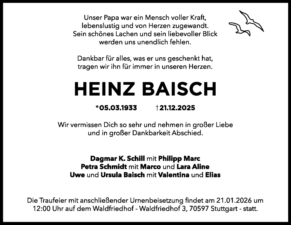 Hier finden Sie alle Traueranzeigen aus der Zeitung, die bisher für Heinz Baisch erschienen sind. Weitere Traueranzeigen, die in der Zeitung erscheinen, werden hier ebenfalls aufgelistet