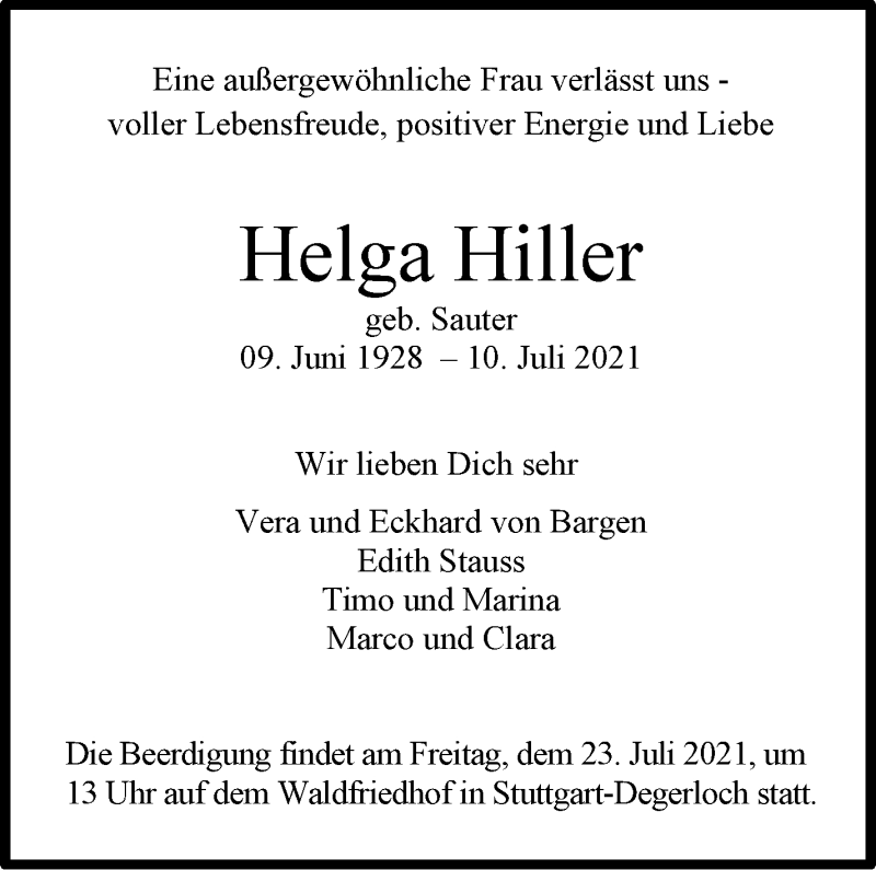 Hier finden Sie alle Traueranzeigen aus der Zeitung, die bisher für Helga Hiller erschienen sind. Weitere Traueranzeigen, die in der Zeitung erscheinen, werden hier ebenfalls aufgelistet