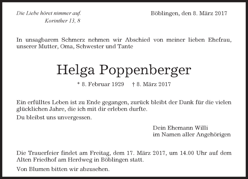 Hier finden Sie alle Traueranzeigen aus der Zeitung, die bisher für Helga Poppenberger erschienen sind. Weitere Traueranzeigen, die in der Zeitung erscheinen, werden hier ebenfalls aufgelistet