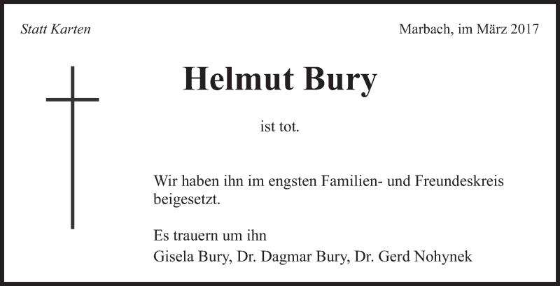 Hier finden Sie alle Traueranzeigen aus der Zeitung, die bisher für Helmut Bury erschienen sind. Weitere Traueranzeigen, die in der Zeitung erscheinen, werden hier ebenfalls aufgelistet