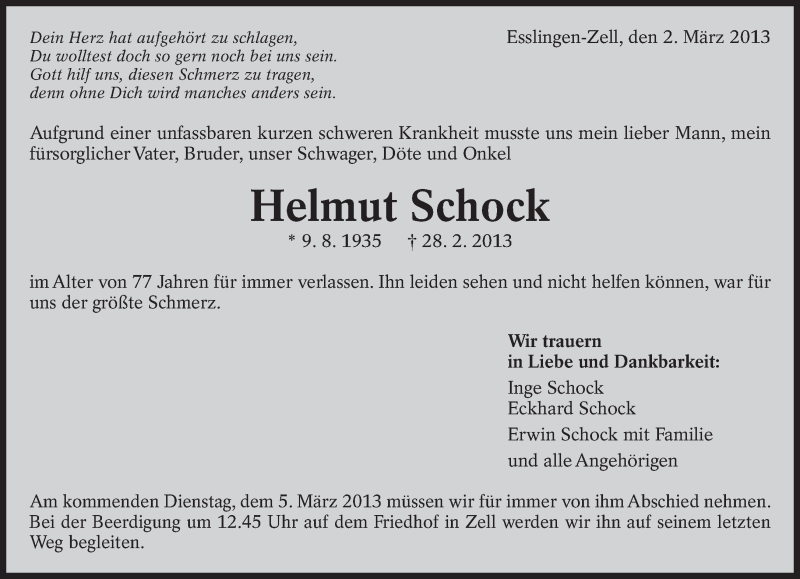 Hier finden Sie alle Traueranzeigen aus der Zeitung, die bisher für Helmut Schock erschienen sind. Weitere Traueranzeigen, die in der Zeitung erscheinen, werden hier ebenfalls aufgelistet