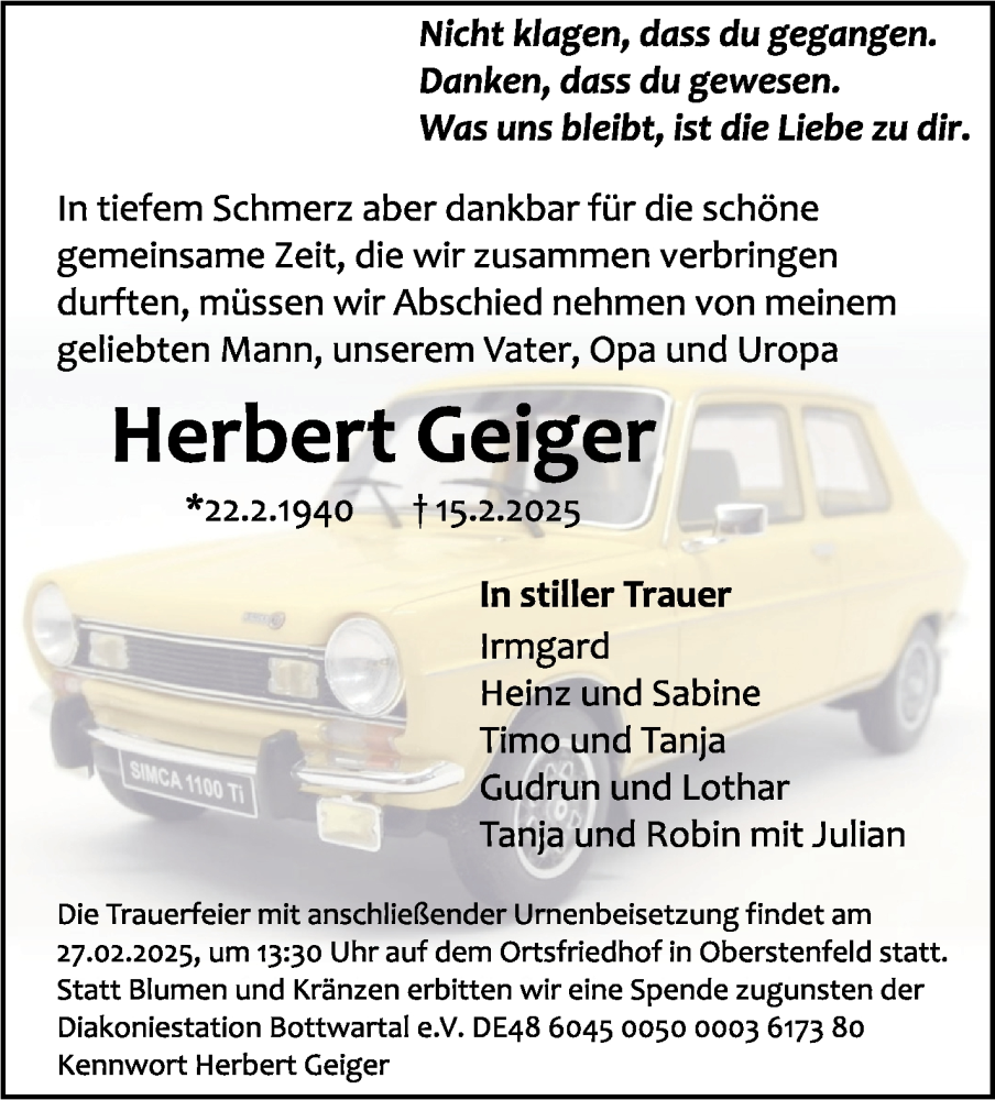 Hier finden Sie alle Traueranzeigen aus der Zeitung, die bisher für Herbert Geiger erschienen sind. Weitere Traueranzeigen, die in der Zeitung erscheinen, werden hier ebenfalls aufgelistet