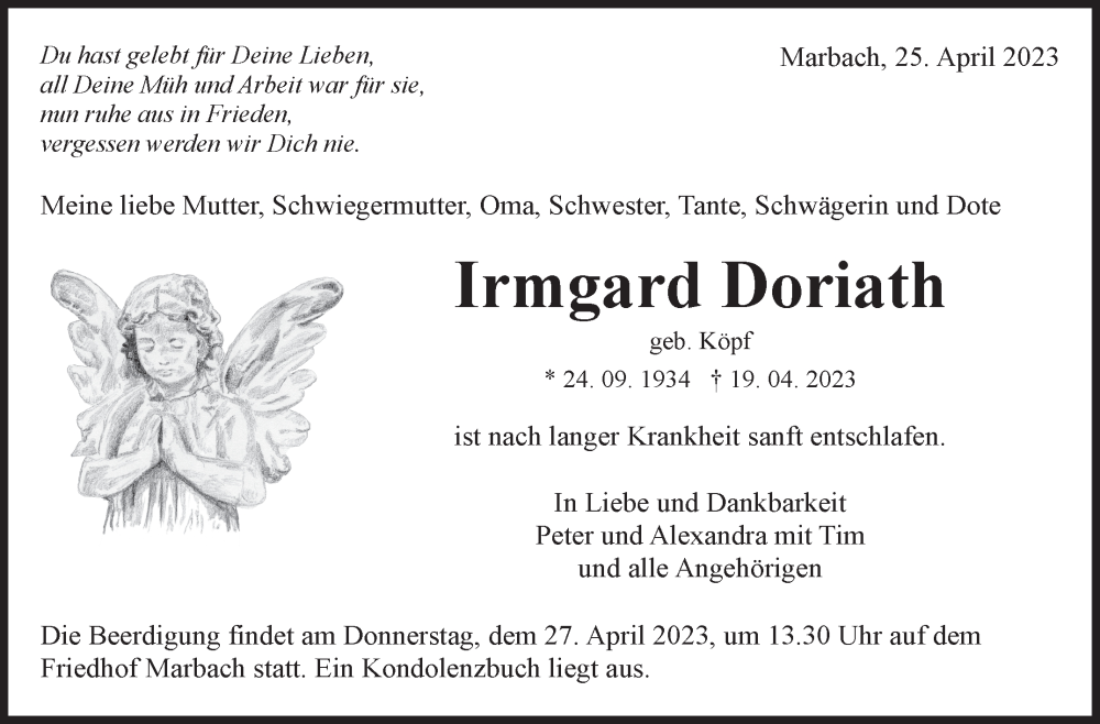 Hier finden Sie alle Traueranzeigen aus der Zeitung, die bisher für Irmgard Doriath erschienen sind. Weitere Traueranzeigen, die in der Zeitung erscheinen, werden hier ebenfalls aufgelistet