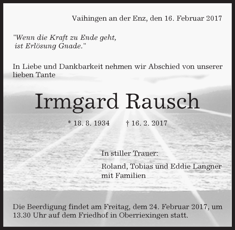 Hier finden Sie alle Traueranzeigen aus der Zeitung, die bisher für Irmgard Rausch erschienen sind. Weitere Traueranzeigen, die in der Zeitung erscheinen, werden hier ebenfalls aufgelistet