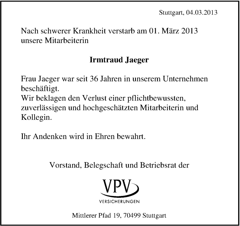 Hier finden Sie alle Traueranzeigen aus der Zeitung, die bisher für Irmtraud Jaeger erschienen sind. Weitere Traueranzeigen, die in der Zeitung erscheinen, werden hier ebenfalls aufgelistet