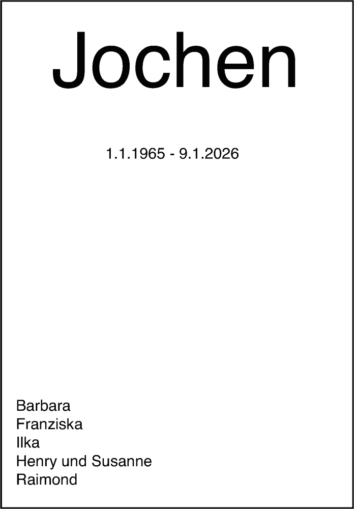 Hier finden Sie alle Traueranzeigen aus der Zeitung, die bisher für Jochen erschienen sind. Weitere Traueranzeigen, die in der Zeitung erscheinen, werden hier ebenfalls aufgelistet