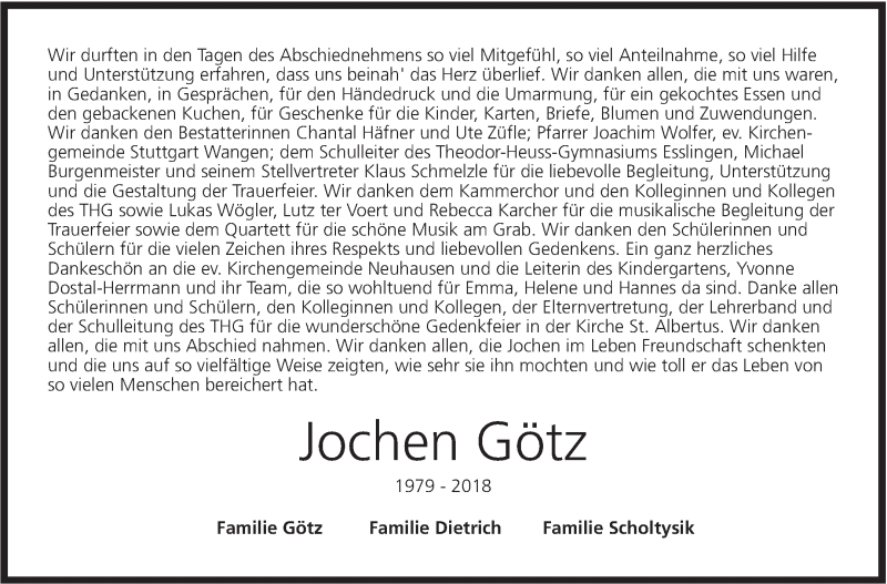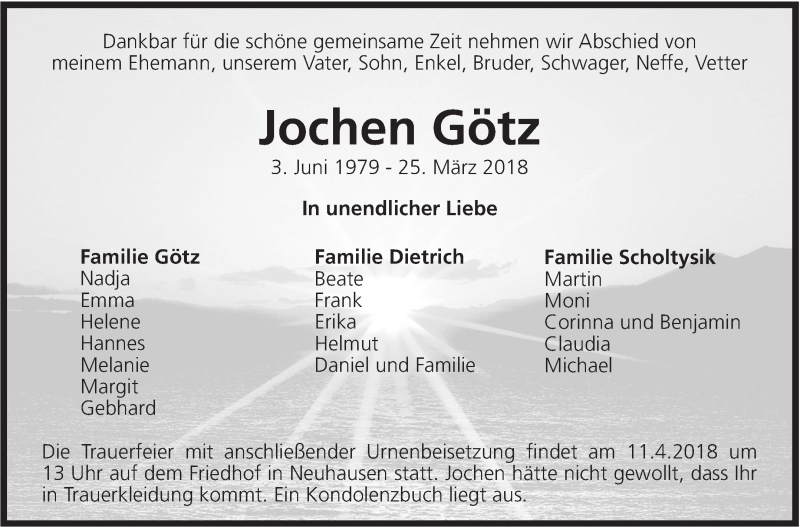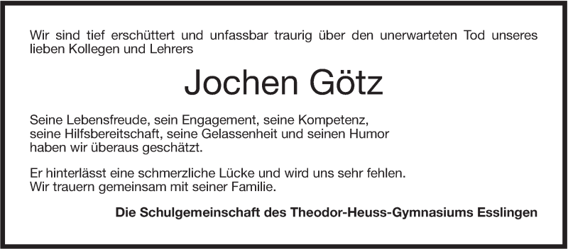 Hier finden Sie alle Traueranzeigen aus der Zeitung, die bisher für Jochen Götz erschienen sind. Weitere Traueranzeigen, die in der Zeitung erscheinen, werden hier ebenfalls aufgelistet