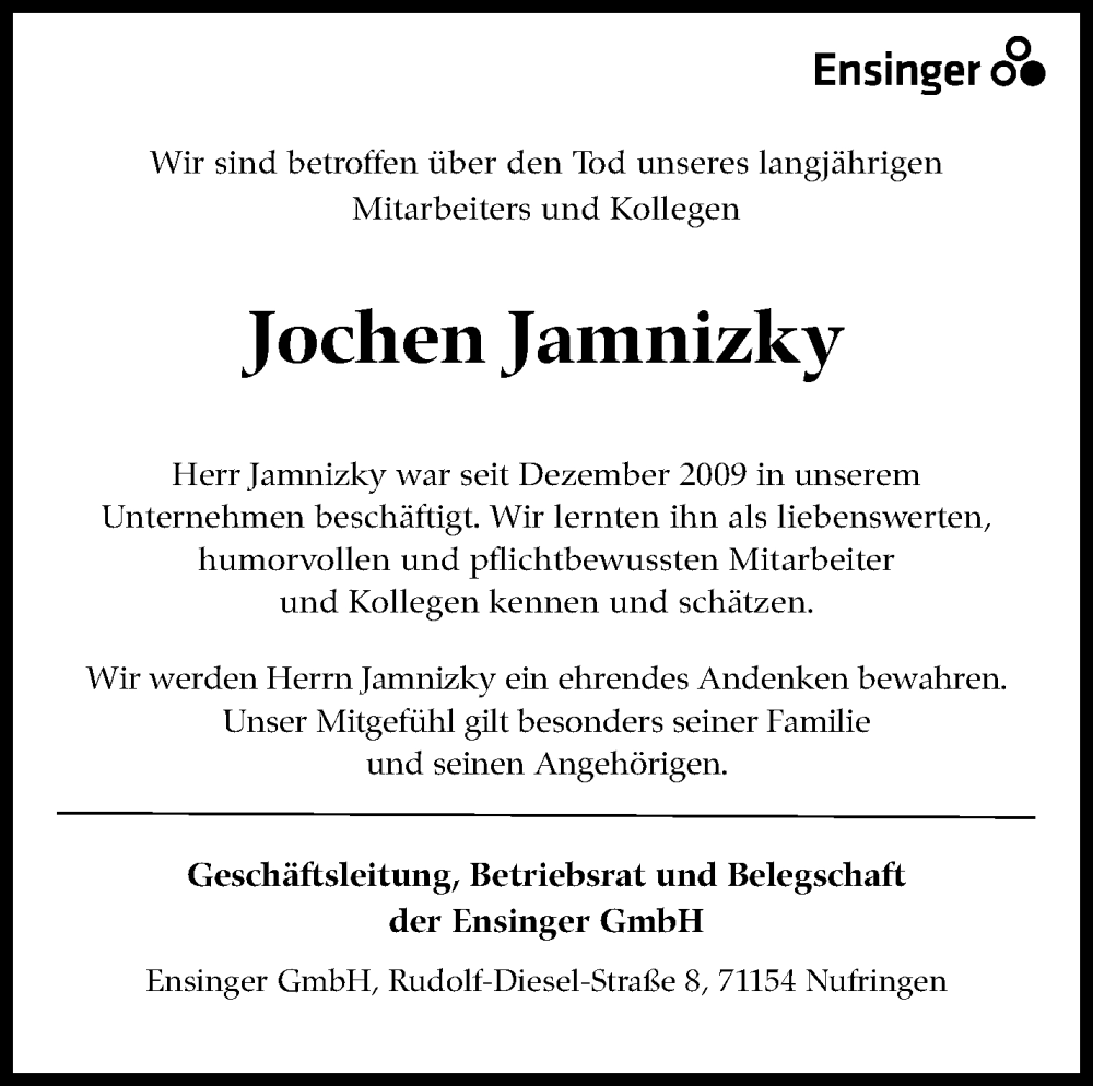 Hier finden Sie alle Traueranzeigen aus der Zeitung, die bisher für Jochen Jamnizky erschienen sind. Weitere Traueranzeigen, die in der Zeitung erscheinen, werden hier ebenfalls aufgelistet