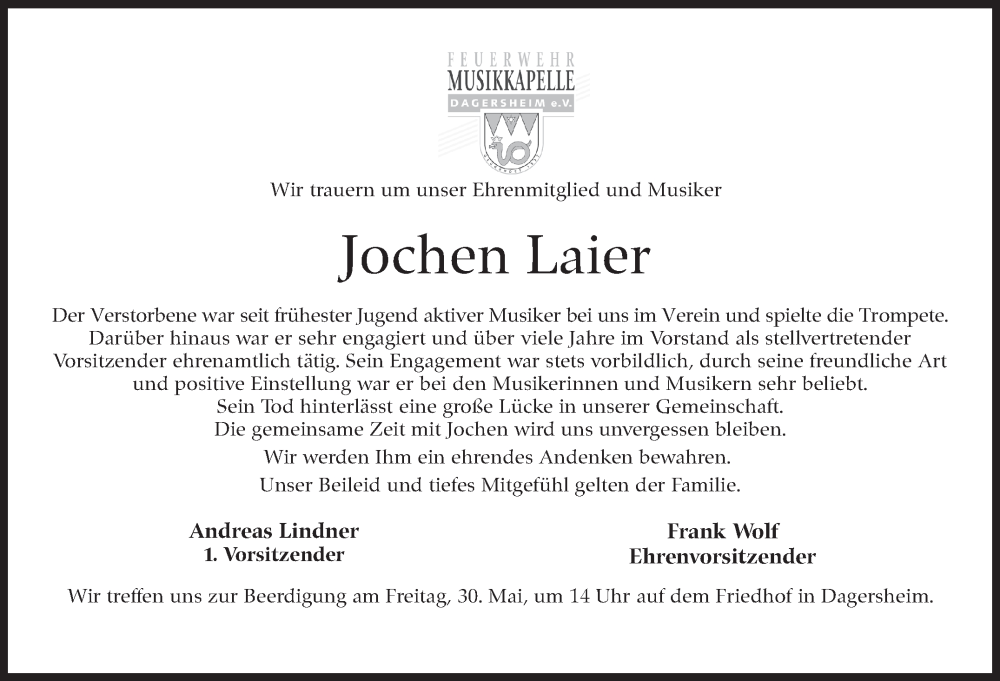 Hier finden Sie alle Traueranzeigen aus der Zeitung, die bisher für Jochen Laier erschienen sind. Weitere Traueranzeigen, die in der Zeitung erscheinen, werden hier ebenfalls aufgelistet