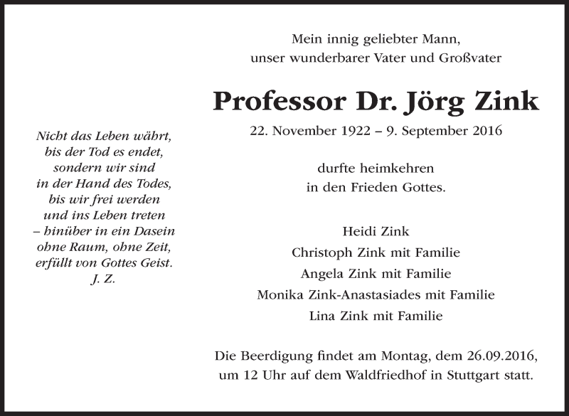 Hier finden Sie alle Traueranzeigen aus der Zeitung, die bisher für Jörg Zink erschienen sind. Weitere Traueranzeigen, die in der Zeitung erscheinen, werden hier ebenfalls aufgelistet