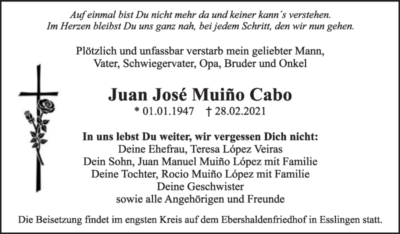 Hier finden Sie alle Traueranzeigen aus der Zeitung, die bisher für Juan Jose Muino Cabo erschienen sind. Weitere Traueranzeigen, die in der Zeitung erscheinen, werden hier ebenfalls aufgelistet