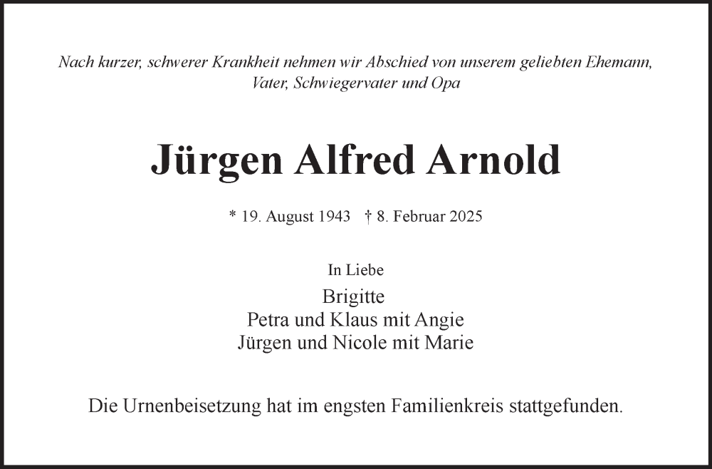 Hier finden Sie alle Traueranzeigen aus der Zeitung, die bisher für Jürgen Arnold erschienen sind. Weitere Traueranzeigen, die in der Zeitung erscheinen, werden hier ebenfalls aufgelistet