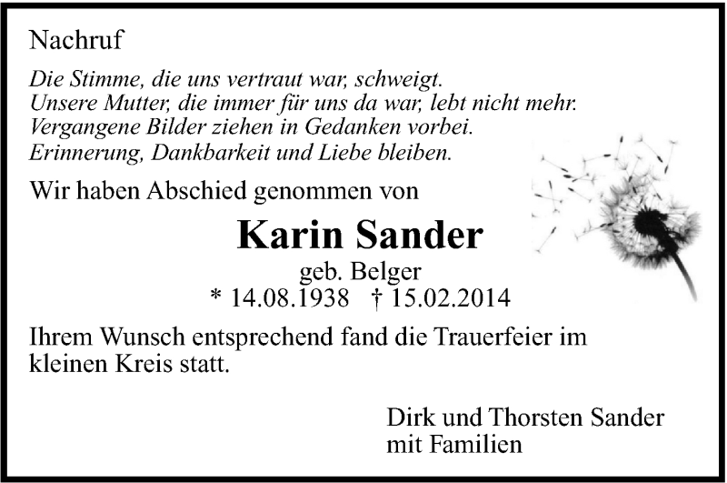 Hier finden Sie alle Traueranzeigen aus der Zeitung, die bisher für Karin Sander erschienen sind. Weitere Traueranzeigen, die in der Zeitung erscheinen, werden hier ebenfalls aufgelistet