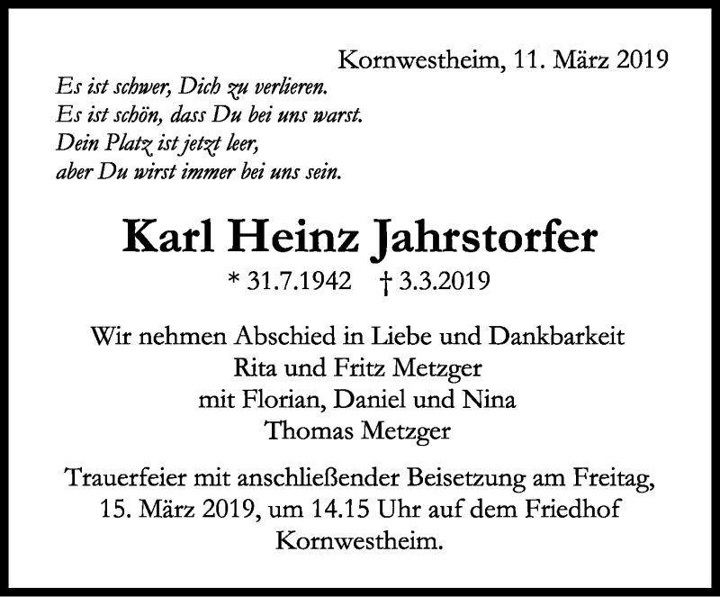 Hier finden Sie alle Traueranzeigen aus der Zeitung, die bisher für Karl Heinz Jahrstorfer erschienen sind. Weitere Traueranzeigen, die in der Zeitung erscheinen, werden hier ebenfalls aufgelistet